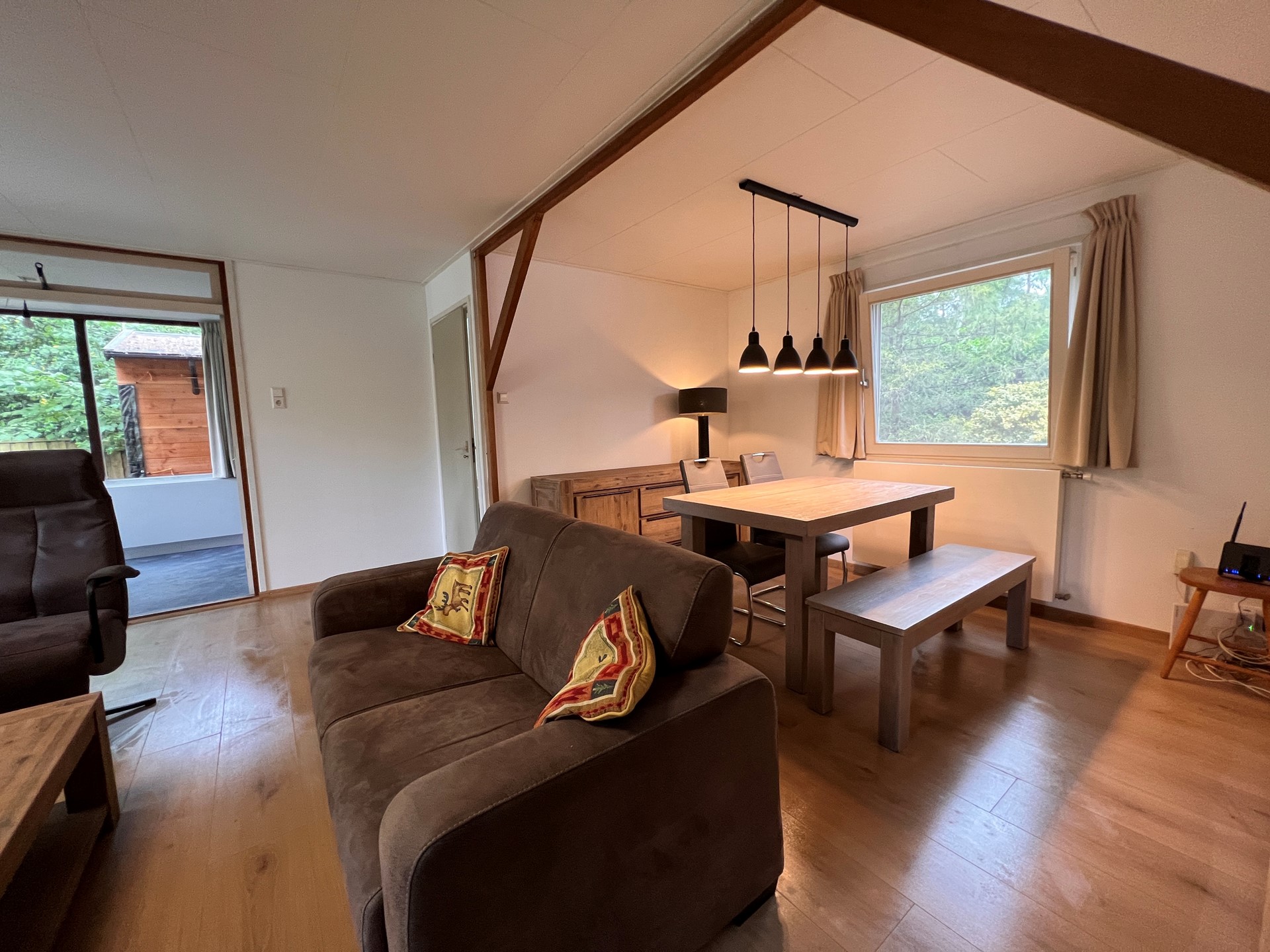 De woonkamer is voorzien van een laminaatvloer en heeft grote ramen en openslaande tuindeuren naar de achtertuin, waardoor er veel natuurlijke lichtinval is en een prettig contact met buiten.
